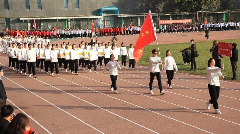 方阵整齐列队,精神抖擞;在行进中高喊口号:“新传新传,造就不凡,博闻明辨、活力无限”,走至主席台前方阵进行队形变换,举起KT板拼出搜同