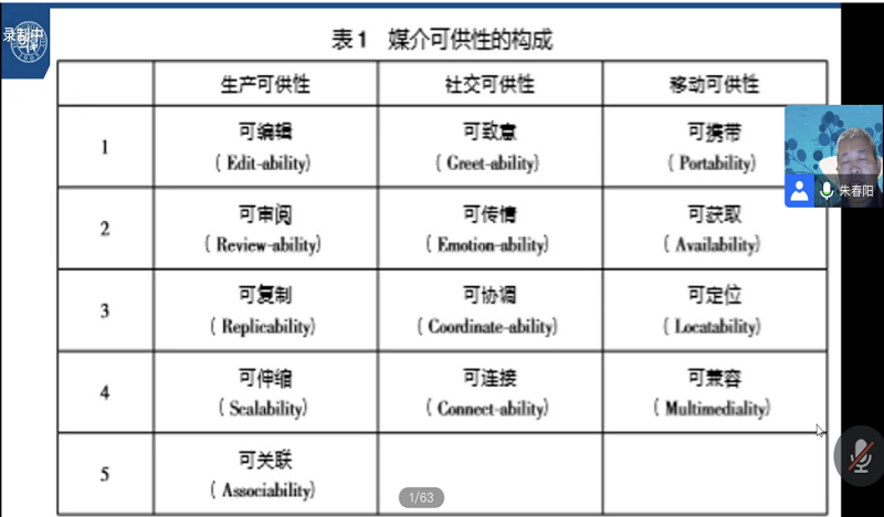 高效的媒介融合不仅是体量上的增加,更应该是媒介可供性不断提升的结果。朱教授为同学们系统介绍了“媒介可供性”的构成:生产可供性、社交可供性、移动可供性。