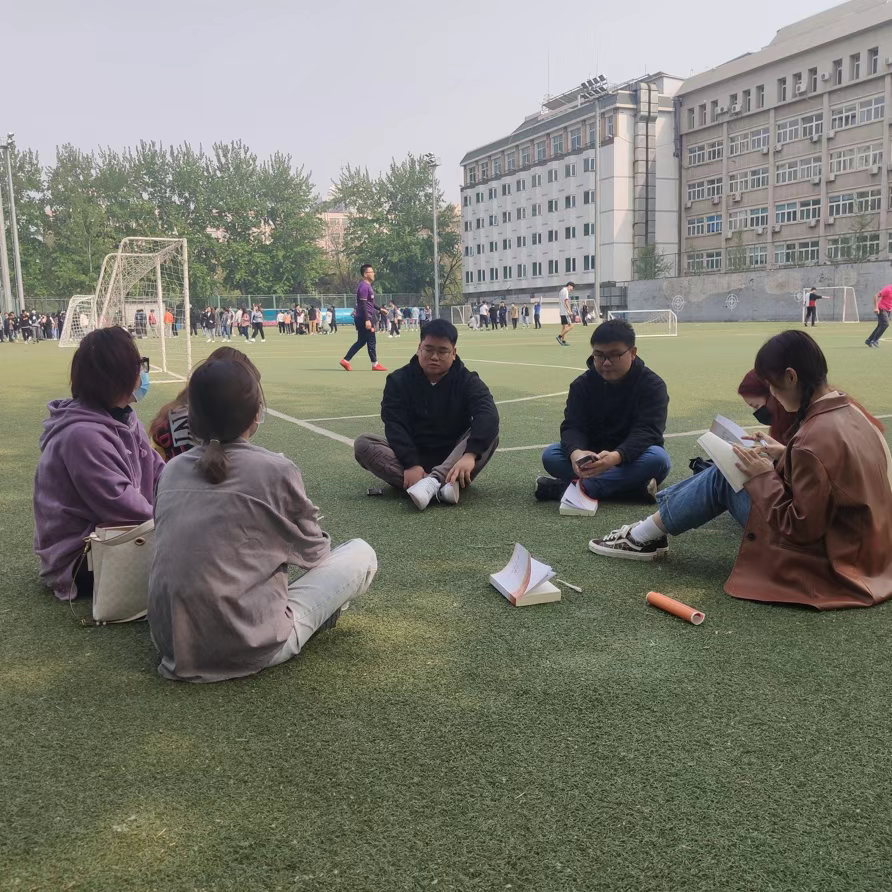 19级学硕党支部在学校的足球场草坪上展开了本学期第一次的党史学习教育交流会。本次学习由支部委员杨小洁同志主持,支部全体党员同志共同参与。