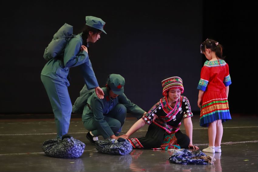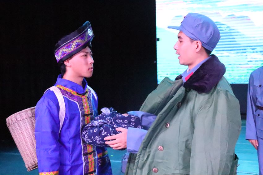 演出谢幕后,校党委副书记邹吉忠与学院领导走上台慰问演出团队。邹书记指出:《长征路·民族情》内部观摩活动非常成功,这是对红军长征历史真实的审美情感再现,创作团队努力地实现了历史真实与艺术真实的熔铸,并将长征精神以新传人独有的方式传承和发扬。邹书记感谢主创团队的创新探索,并希望主创团队进一步精益求精,赋予专业思政剧更多的思想性、艺术性和专业性,进行更多融媒传播,让长征精神绽放时代光芒。