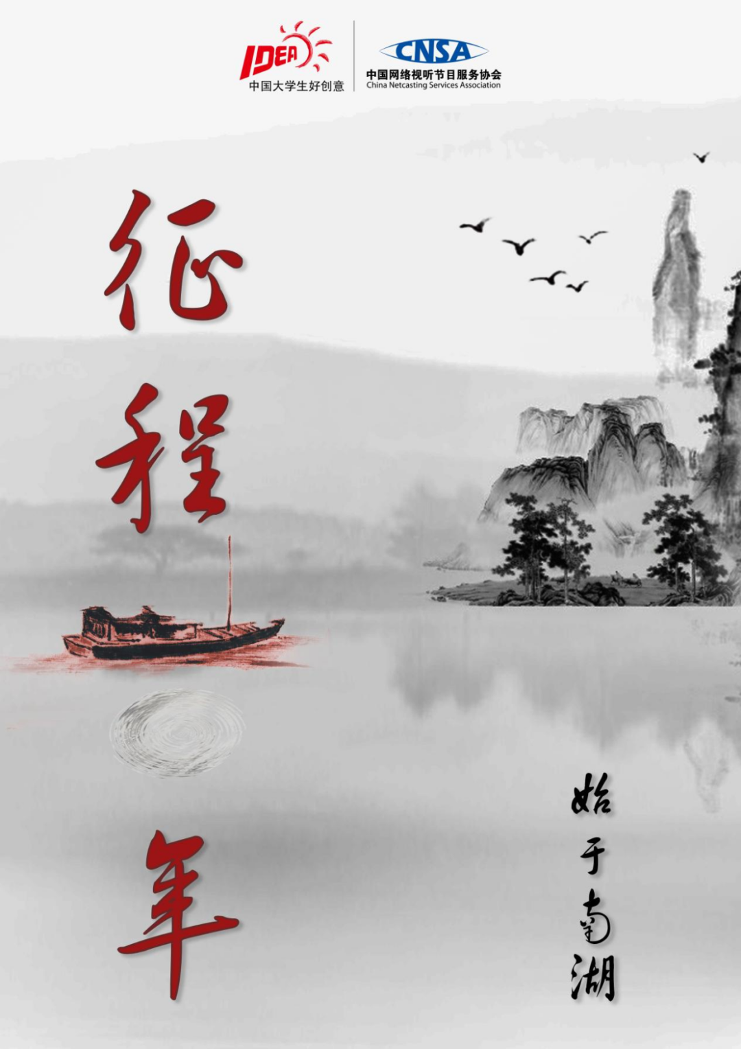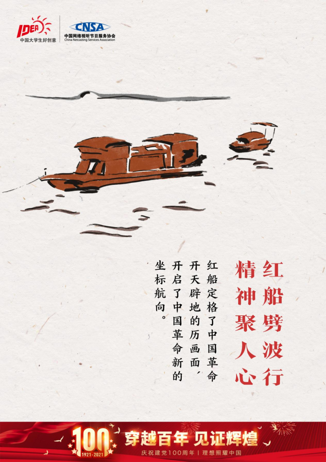 本作品选择了建党百年征程岁月的开创时刻——党的一大会议作为平面广告的创意构思,视觉上将一百年前,发生在浙江嘉兴南湖上,标志着中国共产党伟大诞生的情景进行描绘,同时利用红船与湖面的涟漪水波,象形出“百”字,谕示建党百年的伟大征程,同时体现出红船精神的勇敢开创,体现百年之初,中国共产党在中国近代革命史上击起的涟漪,如今已波澜壮阔,无惧风雨兼程。同时文案上配合象形的“百”字,同时配合画面视觉元素,歌颂“征程百年,始于南湖”这一伟大百年党史的开端。