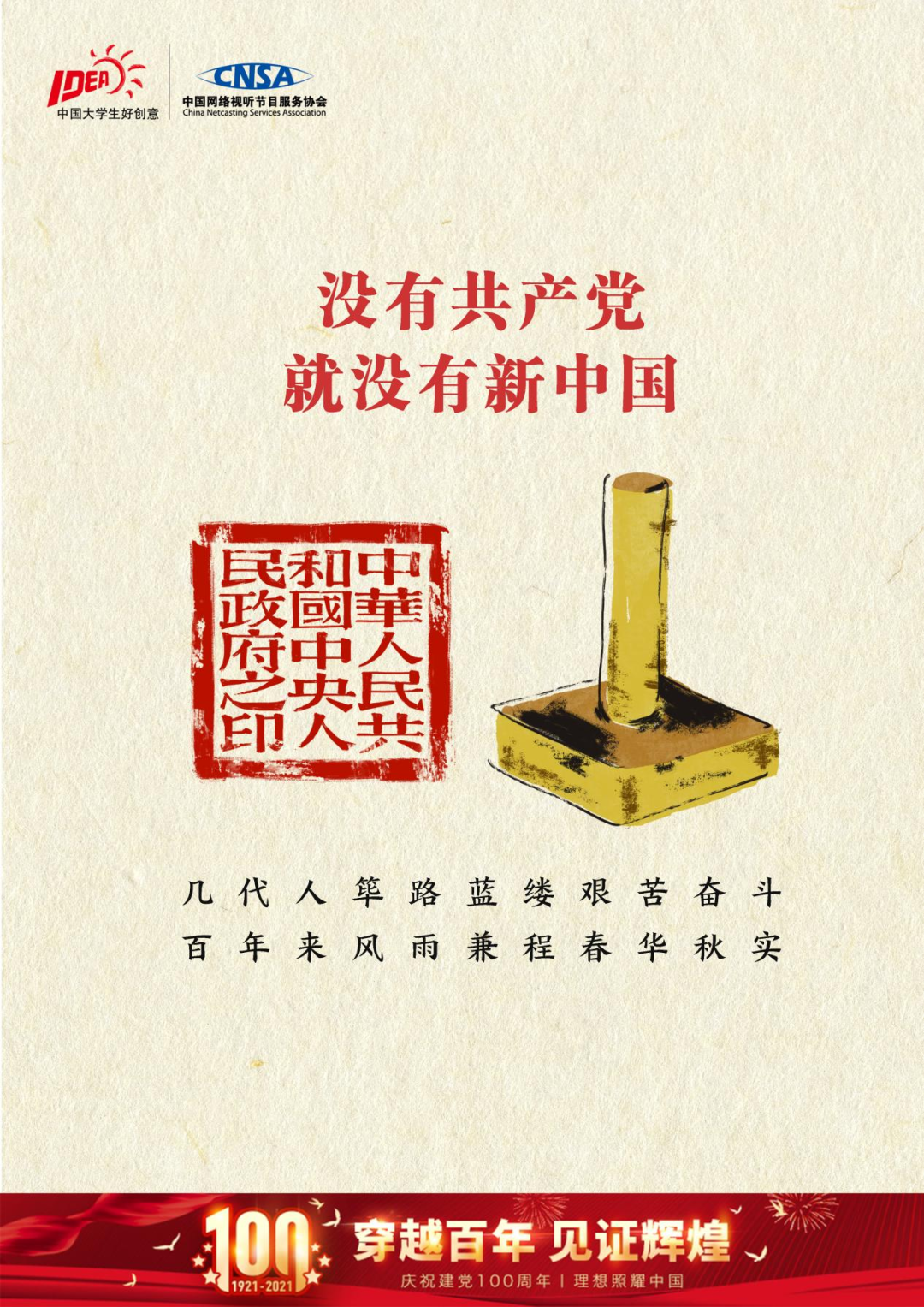 以三组分别代表政治、军事和人民三个方面的剪影为画面的主要部分;呈现和回顾中国共产党在百年历史中为中国作出的贡献。主要色调为红色和黄色,与党的主色调相符,让观者能够感受到党的光辉。是回顾,也是传承,红色的飘带扬起的便是我们对未来的展望,100年,初心不变,我们要带着动人的故事继续前行。