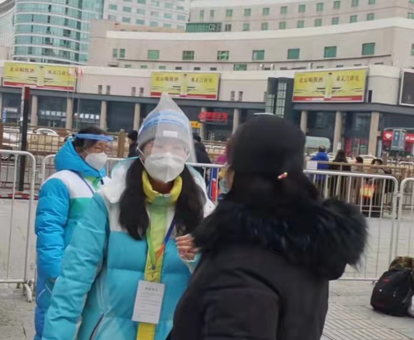 我的工作内容主要是在北京西站的南北广场以及地下二层进行志愿服务,给人们提供帮助。志愿工作需要长时间站立,在南北广场的志愿者还需要在寒冷的室外环境下进行志愿活动。春节假期结束后北京西站流动人口激增,工作量较大,人们询问的问题一般包括核酸检测在哪做;如何进站;哪里可以买到冰墩墩;在哪可以打车和坐公交车等,我都一一耐心解答。