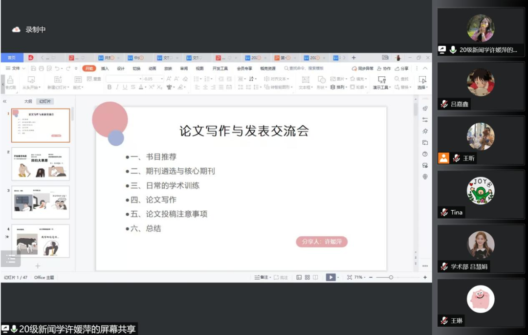 本次学术沙龙邀请了2019级新闻学硕士研究生赵梦晗、2019级新闻与传播硕士研究生何竞祺和2020级新闻学硕士研究生许媛萍作为主讲人,分别从期刊论文的写作内容与投稿方式两方面进行分享。同时本次活动还邀请到了张垒老师和王袁欣老师作为互动和点评嘉宾予以指导。