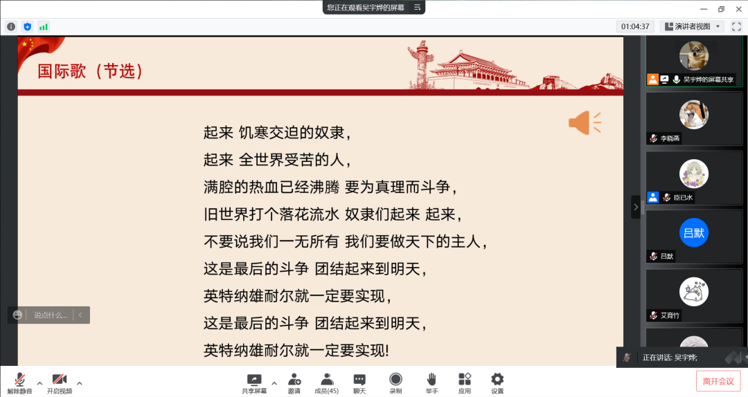 结业仪式在《国际歌》嘹亮的歌声中圆满结束。本期入党积极分子培训班为期一个月,通过入党在线培训平台完成理论讲解、自主学习、综合测试、心得提交、主题实践、结业考试等多个环节,在抗击疫情居家学习的特殊时期,学院党委发挥战斗堡垒作用、丰富培训形式,学员积极参与、表现优异。