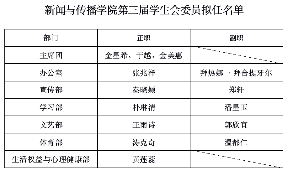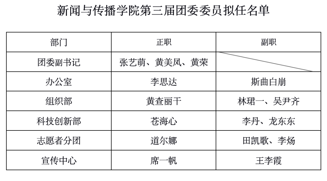 根据《中国共产主义青年团章程》、《搜同 学生会章程》等有关规定,搜同 已于2021年7月7日完成第三届团委、学生会委员的选拔工作。本着公平、公正、公开的原则,经个人报名、鉴定工作表现、面试考核、代表无记名投票及学院党委、团委审议等环节后,拟任用张艺萌等30名同学为搜同 第三届团委、学生会委员,现将拟任用人选名单公示如下: