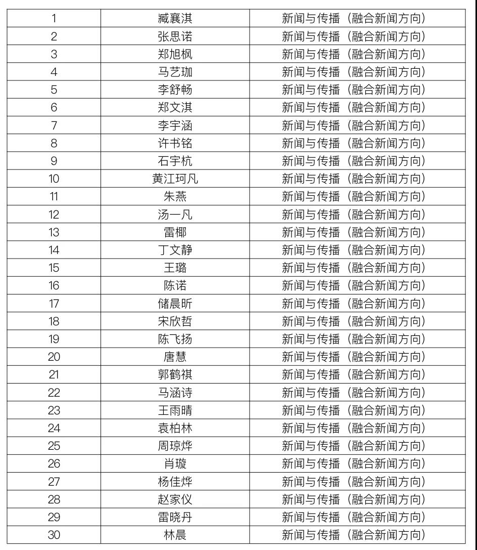 根据营员提交的申请材料、面试成绩和笔试成绩,依据夏令营通知中考核成绩计算方法评定总成绩,以下30名营员(报考志愿为专业硕士融合新闻方向)获得本年度夏令营的“优秀营员”称号(按总成绩先后顺序排列)。