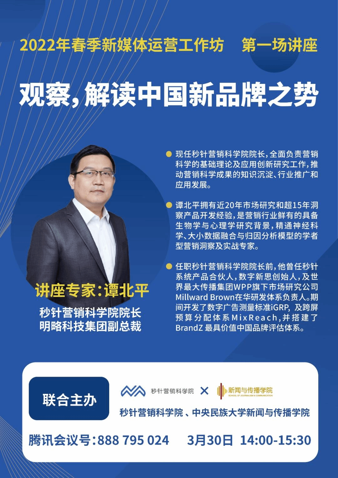 联合秒针营销科学院将共同打造数字创新教学研究合作项目,项目依托于2022年春季学期“新媒体运营工作坊”课程推出系列讲座,与民大新传的师生共同分享业界前沿技术、数字营销理念和数据治理经验。敬请关注。