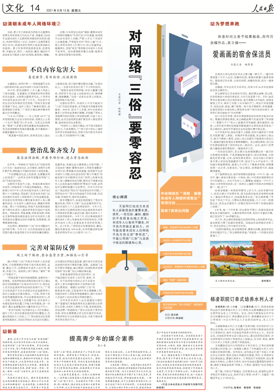8月13日,《人民日报》刊登搜同 广告系主任范小青老师《提高青少年的媒介素养》一文。全文如下:暑假,是青少年与电子设备“亲密接触”的高峰期,这让许多家长担心孩子沉迷游戏,或受到网络“三俗”的不良...